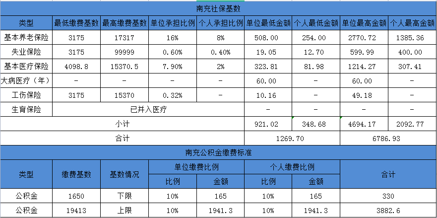 以下是南充市2021年社保、公積金繳費(fèi)基數(shù)表
