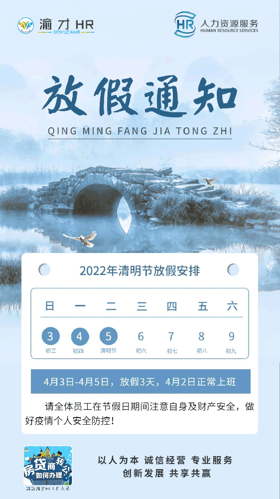 渝才HR清明節(jié)4月3號-4月5號放假,6號正常上班,放假期間如果需要咨詢相關(guān)問題,請直接撥打客服人員電話!